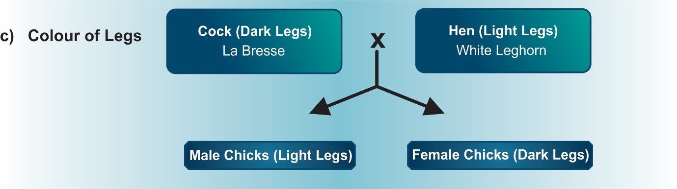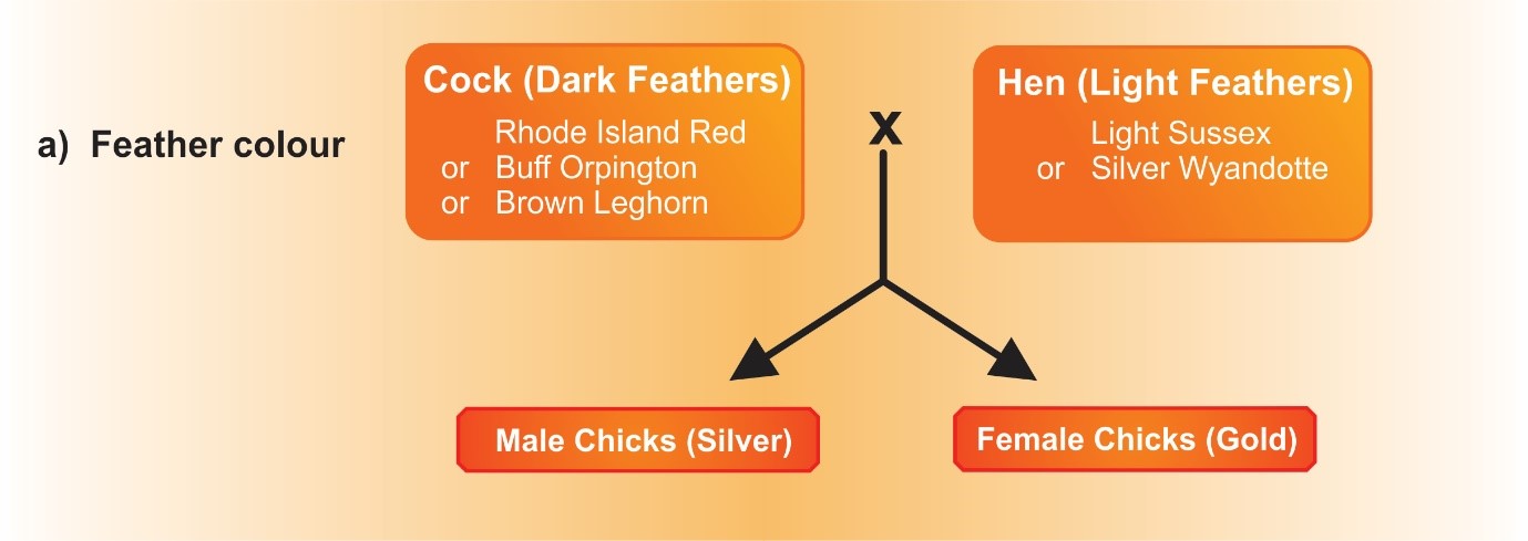 Sex linkage makes use of the fact that certain crosses between pure breeds will produce chickens that can be separated by sexes as soon as they have hatched. Examples of this are: